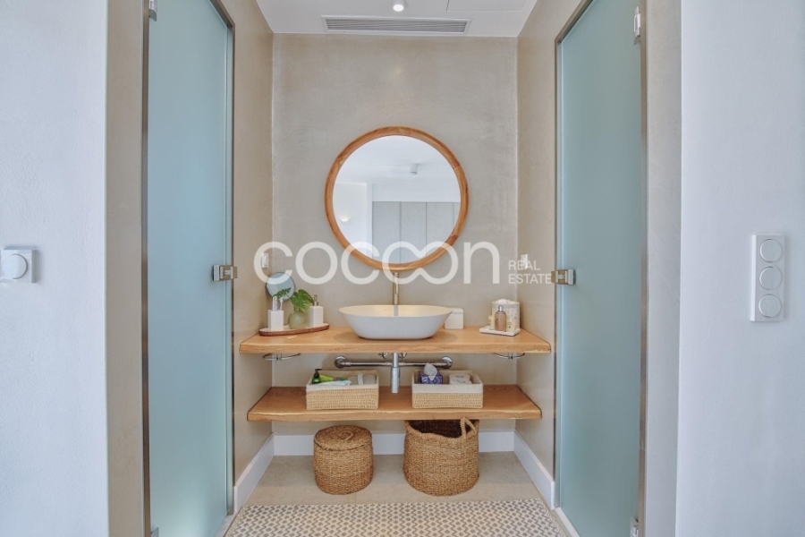 Το κάτω επίπεδο φιλοξενεί 2 master υπνοδωμάτια με en suite μπάνια, ένα wc καθώς και το μηχανοστάσιο της πισίνας.