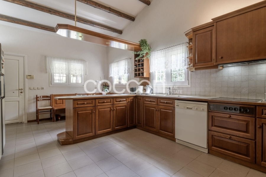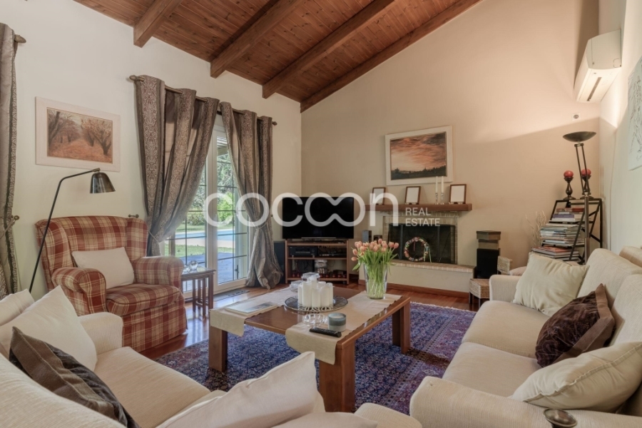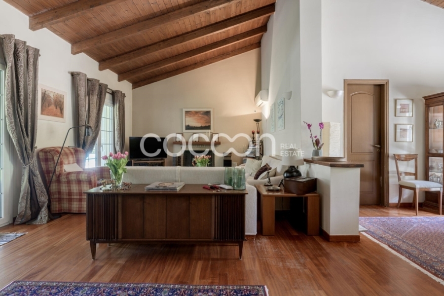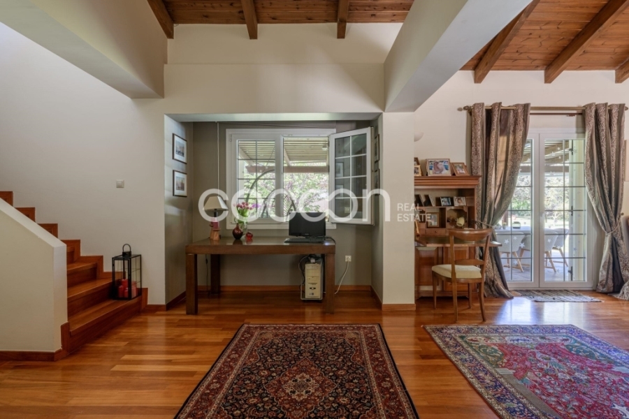 Το ισόγειο φιλοξενεί μεγάλο και φωτεινό χώρο υποδοχής με τζάκι, ανεξάρτητη κουζίνα και wc επισκεπτών. Το επίπεδο αυτό βγάζει σε μεγάλη σκεπαστή βεράντα 43 τ.μ.
