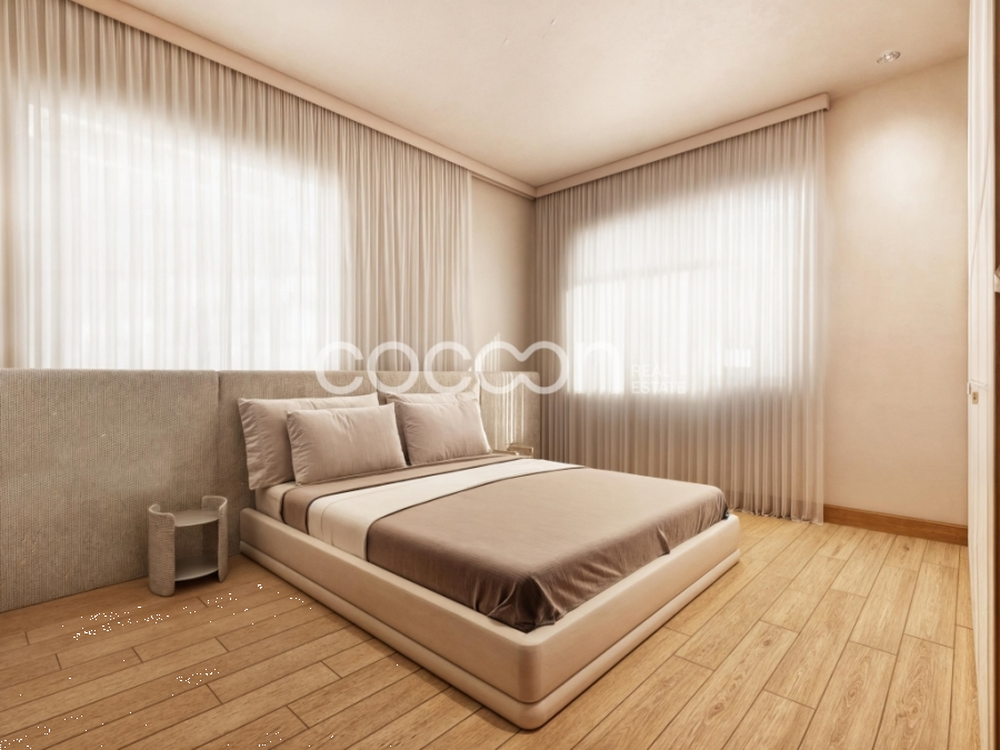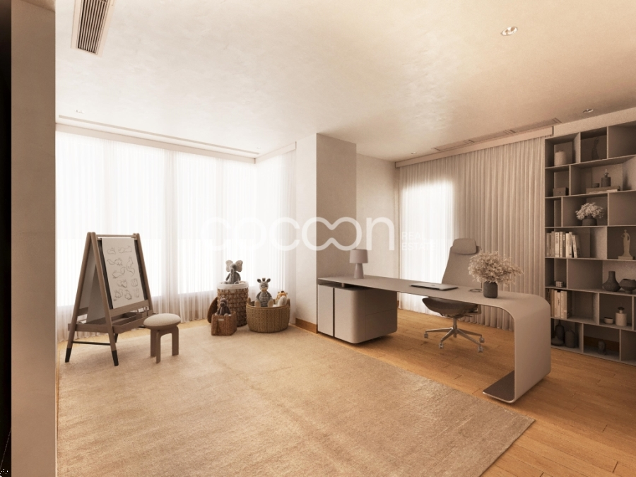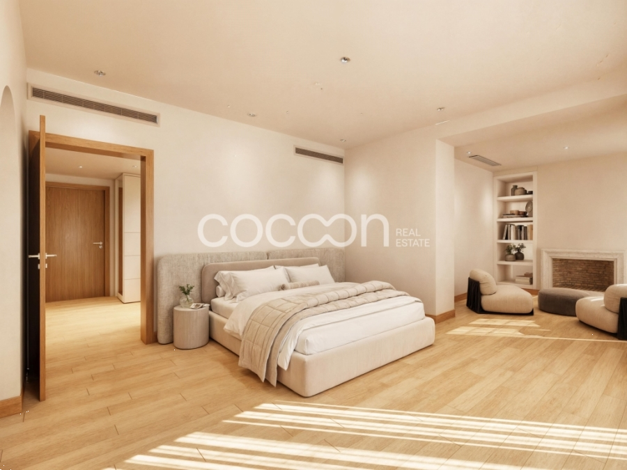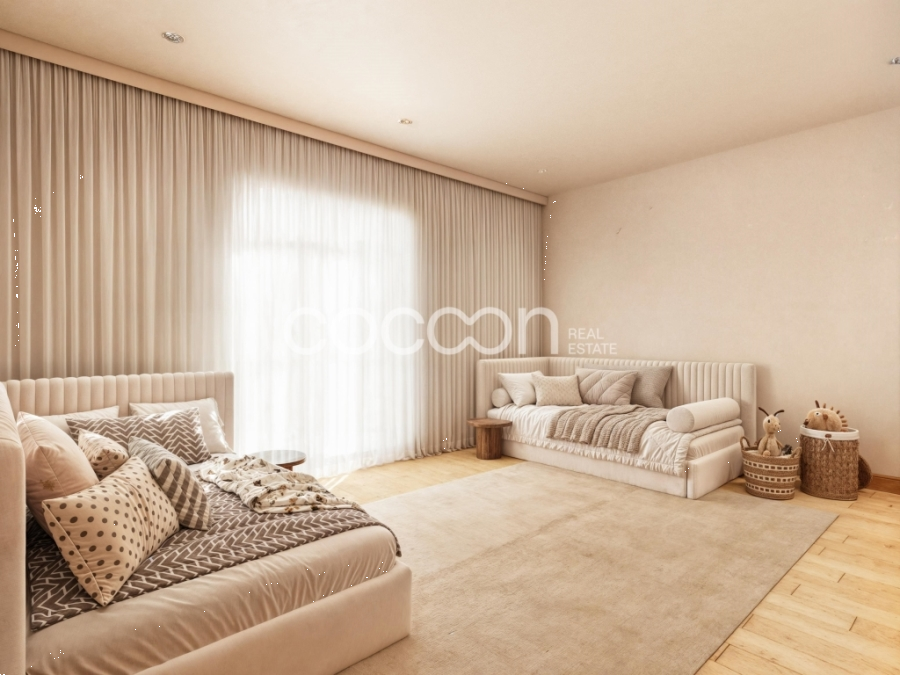 Ωραία κατασκευασμένη σκάλα, επενδεδυμένη με ξύλο, οδηγεί στον όροφο (201τμ) όπου στην κατάληξή της υπάρχει πλάτωμα με πολλές βοηθητικές ντουλάπες. Επιπλέον στο επίπεδο αυτό βρίσκονται 3 δωμάτια με en-suite μπάνια επενδεδυμένα και εξοπλισμένα με υλικά και είδη υγιεινής υψηλών προδιαγραφών. Το master υπνοδωμάτιο διαθέτει χωλ που λειτουργεί και ως dressing room, μεγάλο μπάνιο en-suite ενώ το δωμάτιο περιέχει καθιστικό, χώρο ύπνο και επιπλέον χώρο για γραφείο. Στον όροφο υπάρχει επίσης καθιστικό το οποίο θα μπορούσε να διαμορφωθεί σε τέταρτο υπνοδωμάτιο.