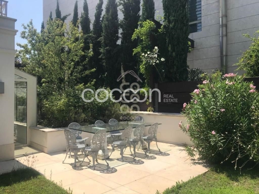 Στο ισόγειο (216τμ) βρίσκεται ο μεγάλος χώρος υποδοχής, η τραπεζαρία, WC επισκεπτών, μεγάλη κουζίνα με χώρο φαγητού καθώς και επιπλέον μεγάλος χώρος που μπορεί να χρησιμοποιηθεί σαν καθημερινό καθιστικό ή και ως γραφείο. Όλοι οι χώροι του ισογείου βγάζουν στον κήπο περιμετρικά ο οποίος είναι όμορφα διαμορφωμένος με παρτέρια και επιφάνειες τόσο πλακόστρωτες όσο και με γκαζόν.