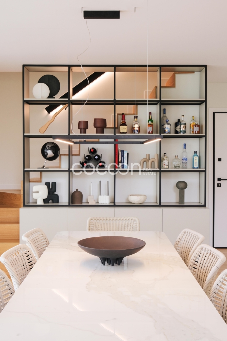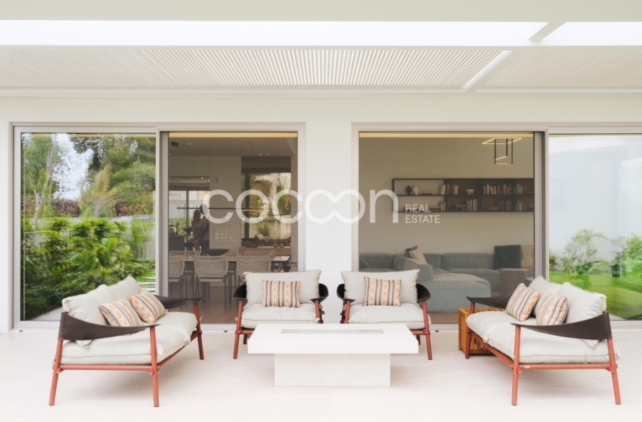 Το ισόγειο επίπεδο (123 τ.μ.) διαμορφώνεται σε άνετο και φωτεινό χώρο υποδοχής με τραπεζαριά, open plan κουζίνα, ένα υπνοδωμάτιο με δικό του μπάνιο και wc επισκεπτών. Το σαλόνι διαθέτει διπλό ύψος και μεγάλα ανοίγματα που βγάζουν σε καταπράσινο κήπο 400 τ.μ., ιδιόχρηστη πισίνα και στεγασμένο εξωτερικό καθιστικό.