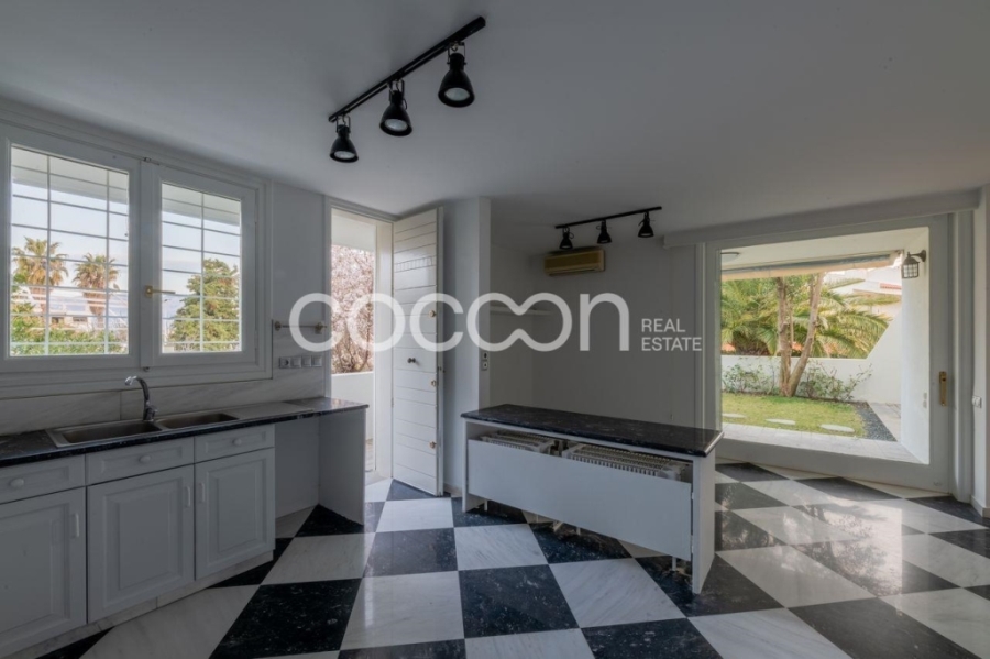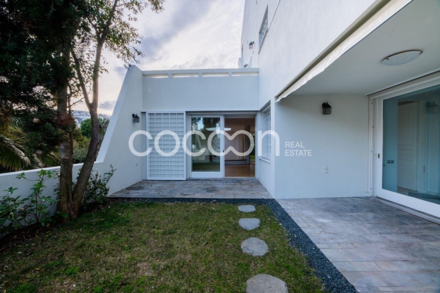 Το ισόγειο αποτελείται από χωλ εισόδου, μεγάλο χώρο υποδοχής με τζάκι, ξεχωριστή τραπεζαρία, μεγάλη, φωτεινή κουζίνα και wc επισκεπτών. Το επίπεδο αυτό βγάζει σε ωραία αυλή.