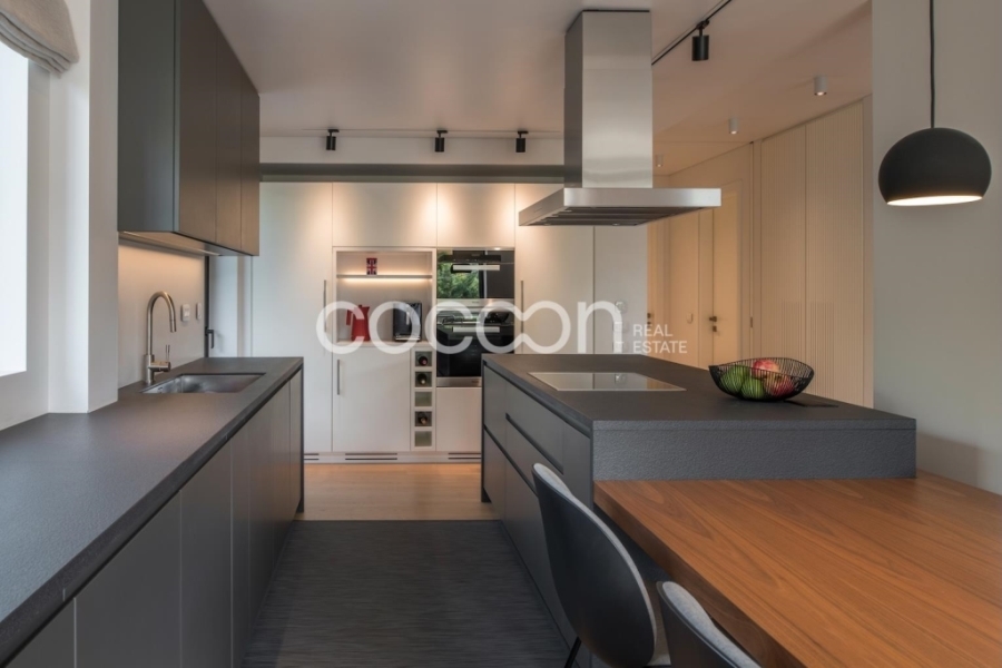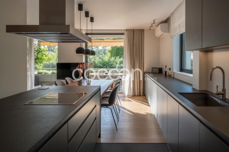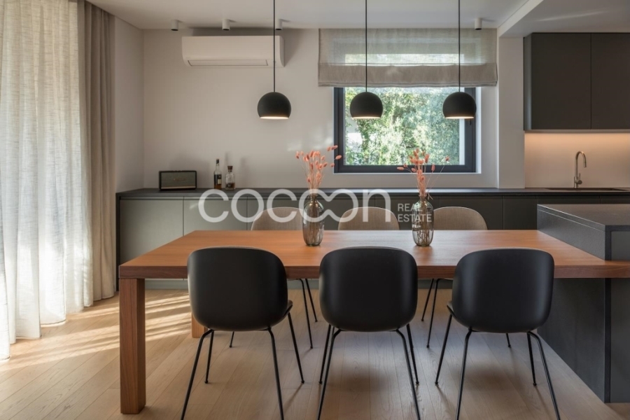 Αποτελείται από όμορφο χώρο υποδοχής, open plan κουζίνα πλήρως εξοπλισμένη με island στη συνέχεια του οποίου αναπτύσσεται μεγάλο τραπέζι που μπορεί να φιλοξενήσει 8 άτομα.