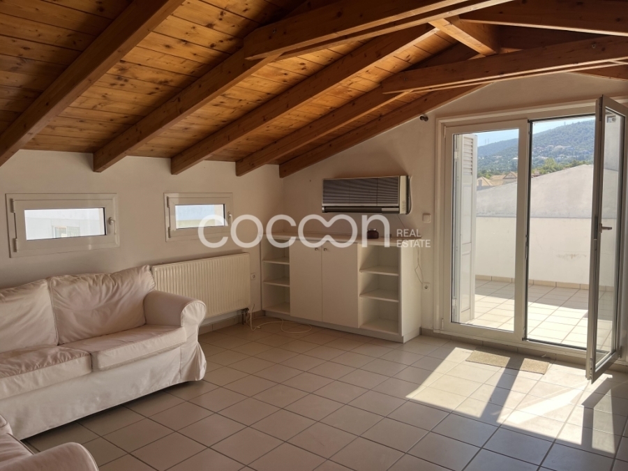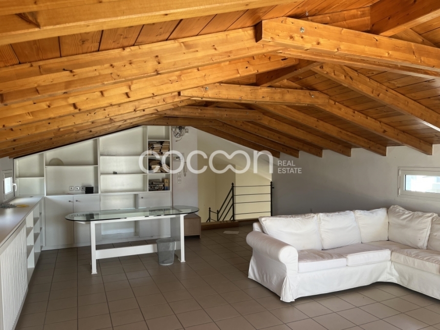 Στο πιο πάνω επίπεδο αναπτύσσεται μεγάλη σοφίτα που βγάζει σε βεράντα με θέα το βουνό.